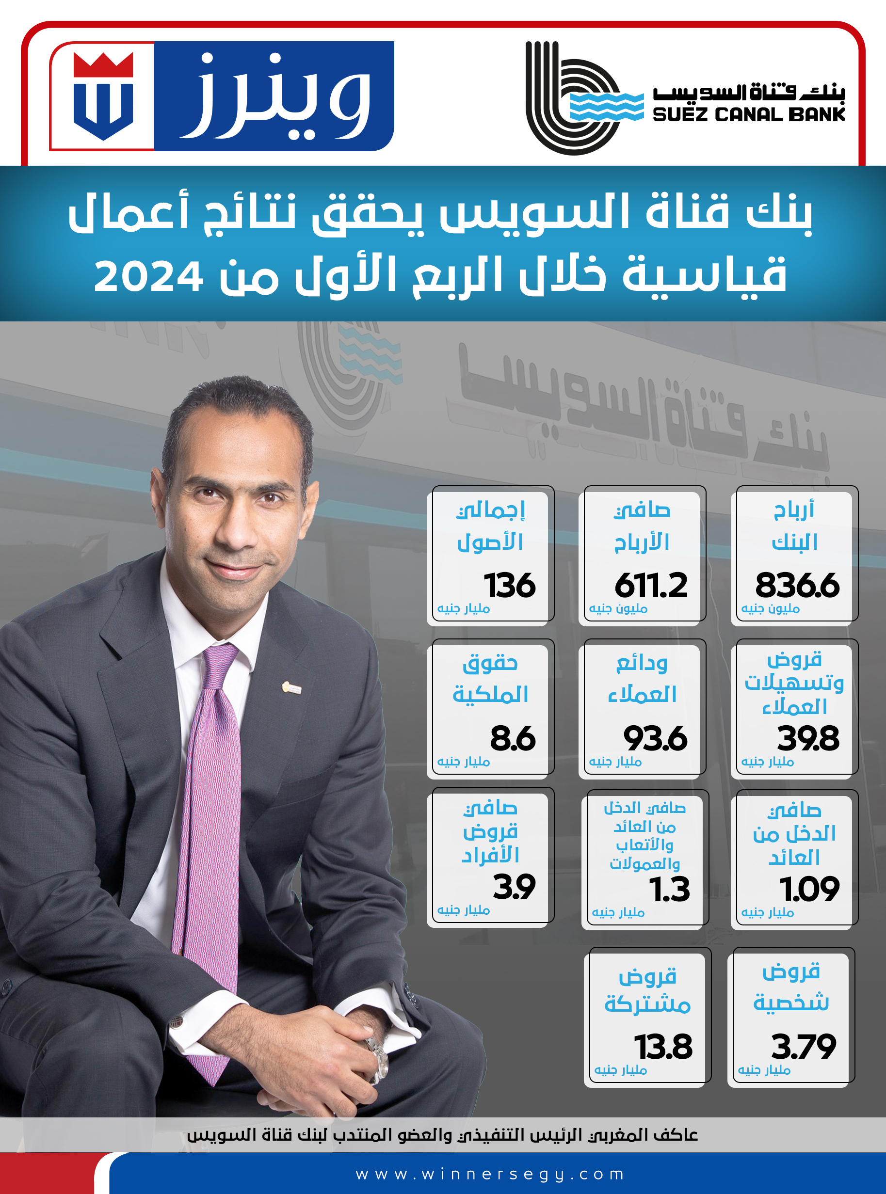 تمكن بنك قناة السويس، بقيادة عاكف المغربي الرئيس التنفيذي والعضو المنتدب للبنك، من تحقيق أرباح بقيمة 836.675 مليون جنيه بنهاية الربع الأول من 2024، مقابل 609.394 مليون جنيه بنهاية مارس 2023، فيما بلغ صافي الربح بقيمة 611.248 مليون جنيه بنهاية مارس 2024، مقابل 250.967 مليون جنيه بنهاية مارس 2023، لذا نستعرض في الإنفوجراف التالي أبرز مؤشرات البنك بنهاية الربع الأول من العام الجاري.