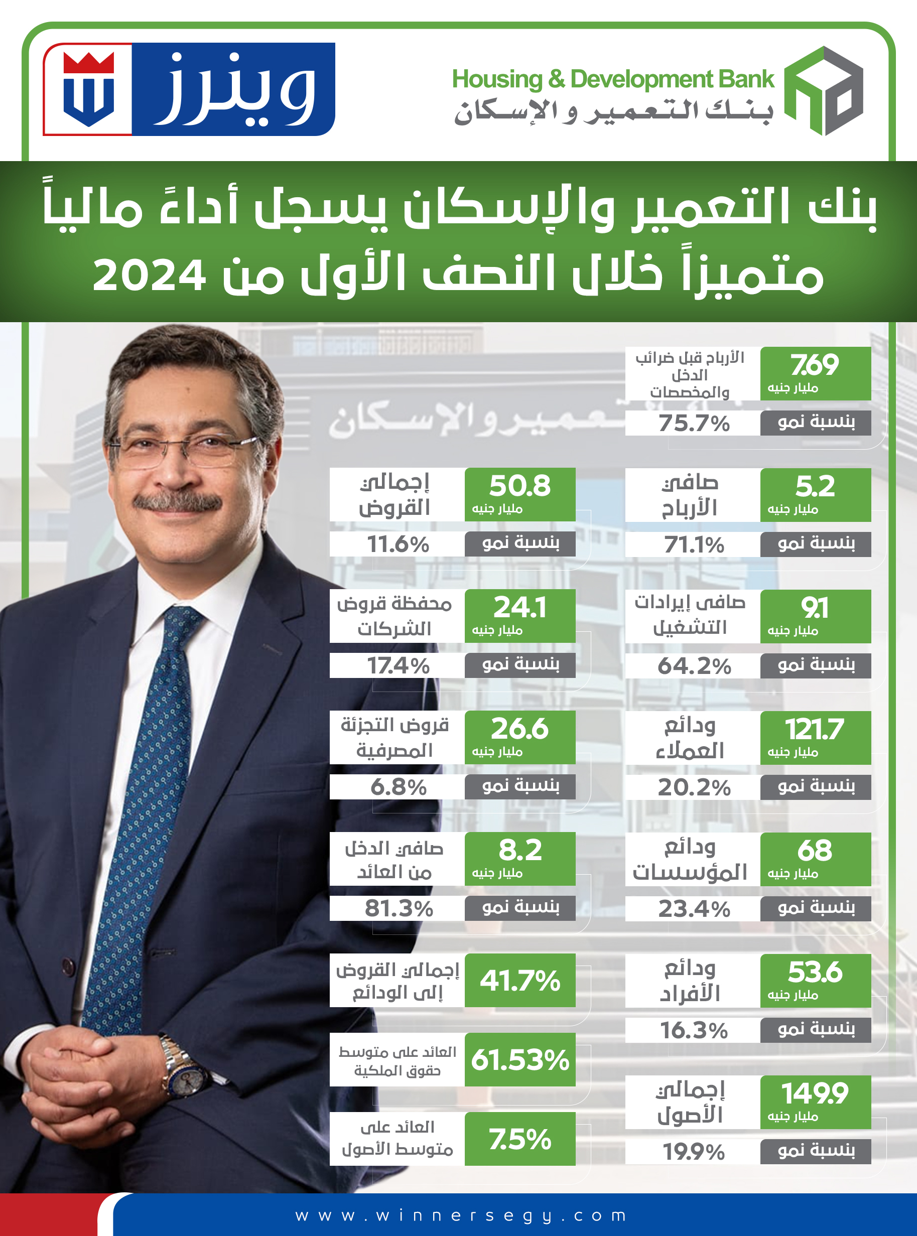 إنفوجراف.. بنك التعمير والإسكان يسجل أداءً مالياً متميزاً خلال النصف الأول من 2024