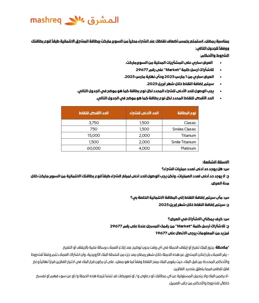 أعلن بنك المشرق، عبر صفحته الرسمية على موقع التواصل الاجتماعي فيسبوك، عن أحدث عروضه للعملاء حاملي بطاقاته الائتمانية بمناسبة شهر رمضان.